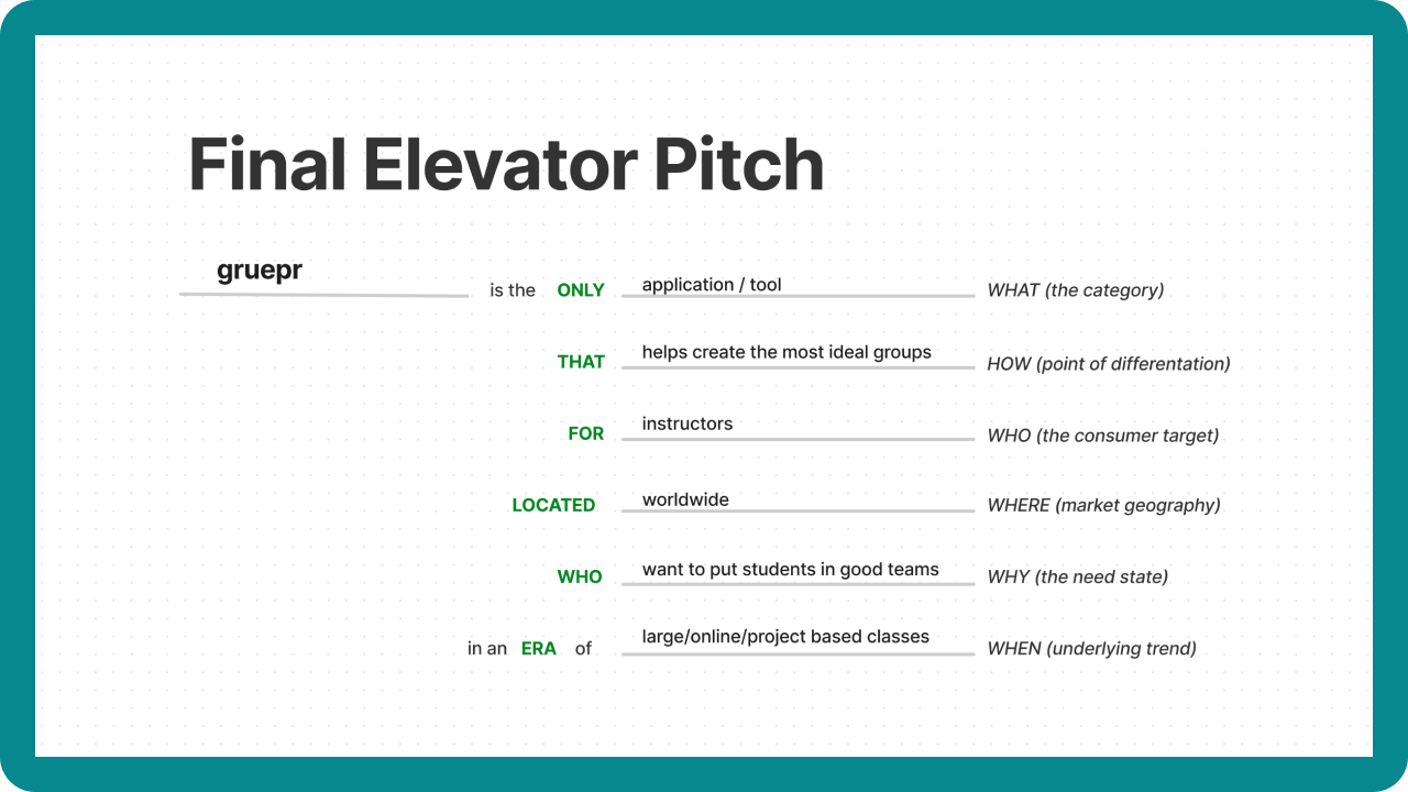 The first exercise we ran through was creating an elevator pitch for Gruepr. The goal for this exercise is to make sure both the team side and the client understands and agrees on the main goal of the product.