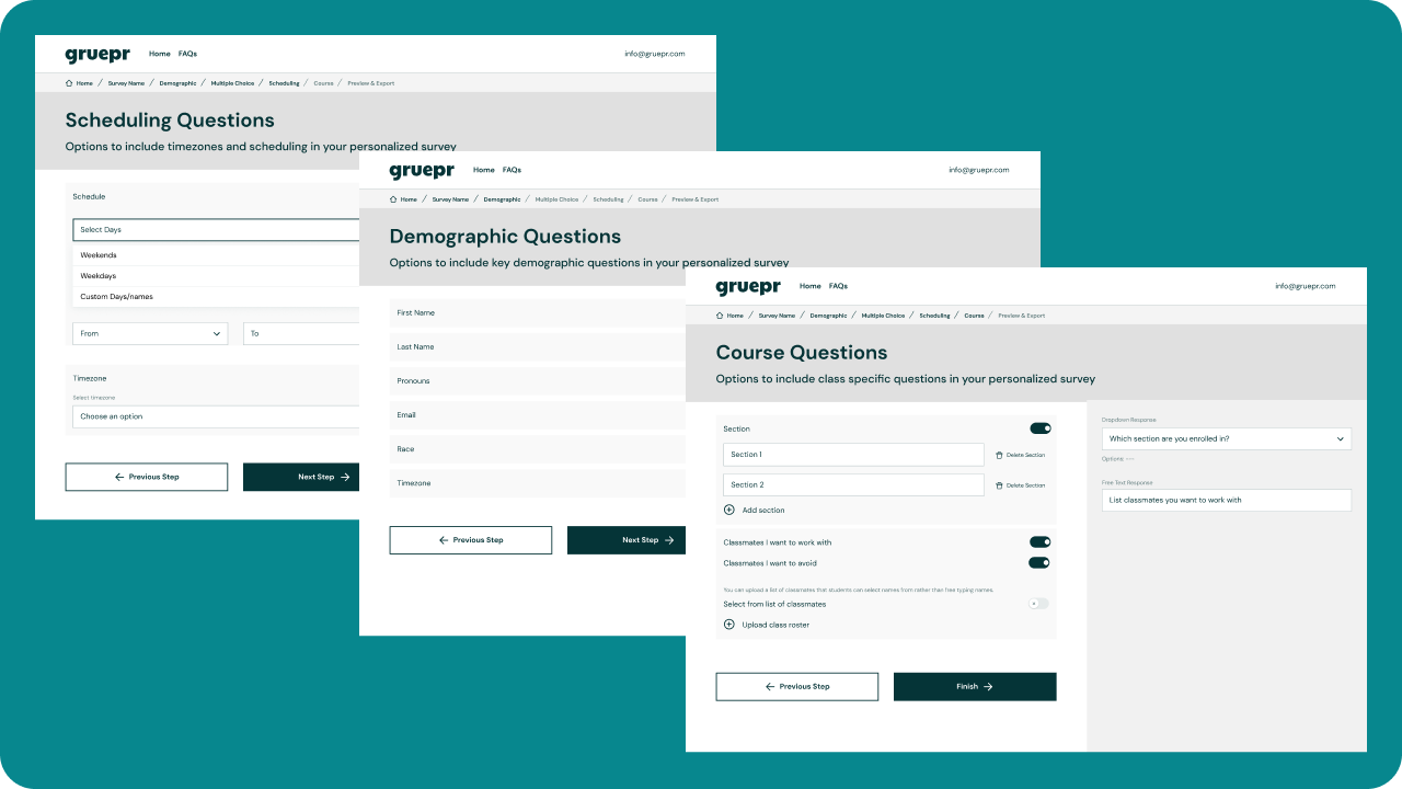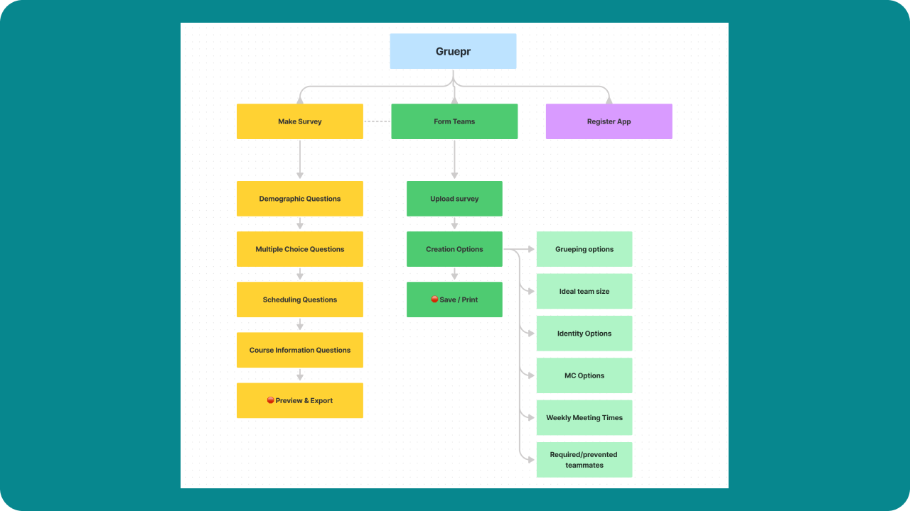Once the wireframes were finalized, the team moved on to the design stage using the wireframes as a guide. This allowed us to focus on the aesthetics and functionality of the app without getting bogged down in the details of layout and navigation. Overall, the wire-framing process was essential to the development of Gruepr and helped to ensure that the final product was intuitive and easy to use for professors and instructors.