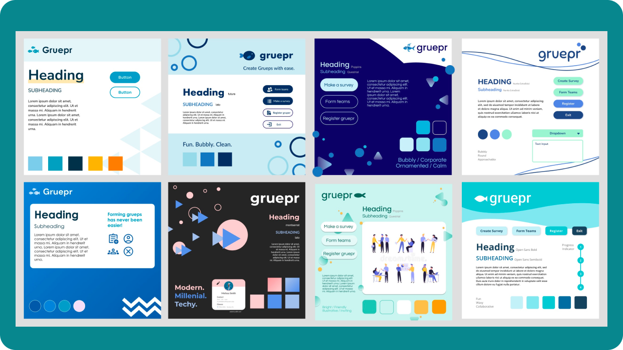 Designing the branding for Gruepr was a collaborative process that involved mood boarding, client feedback, and a deep dive into sea puns. To begin the process, the team worked with the client to participate in two branding exercises, to help establish the tone and client needs for this project.