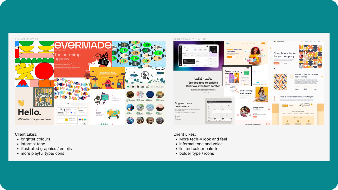 From here, we created mood boards to explore different design concepts and ideas keeping these themes in mind. The mood boards included a variety of images, colors, and copy inspired by various directions each of the designers wanted to take. This activity helped the team synthesize their thoughts on the overall aesthetic of the project.