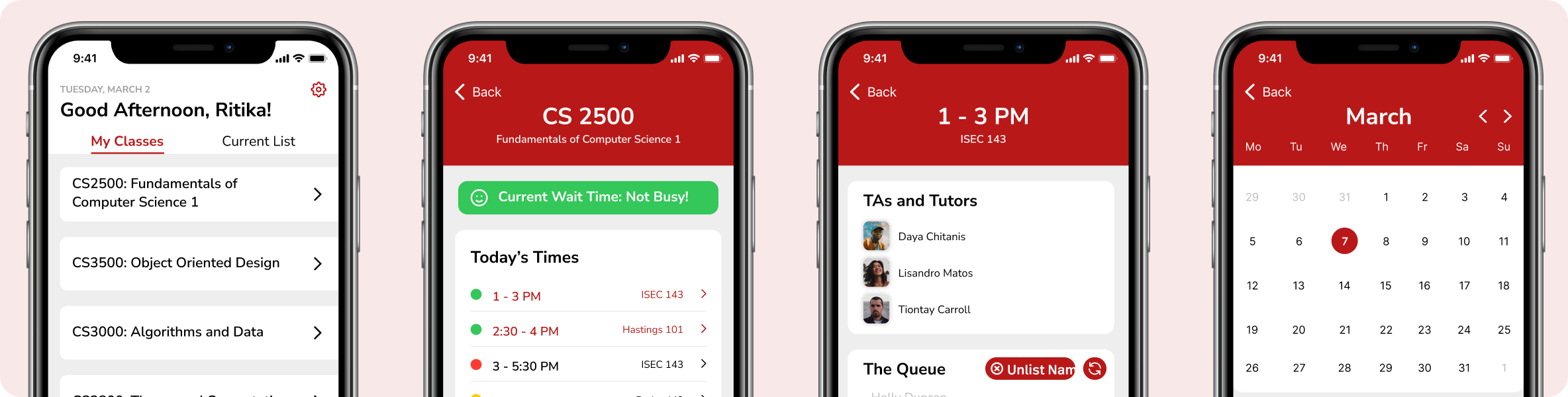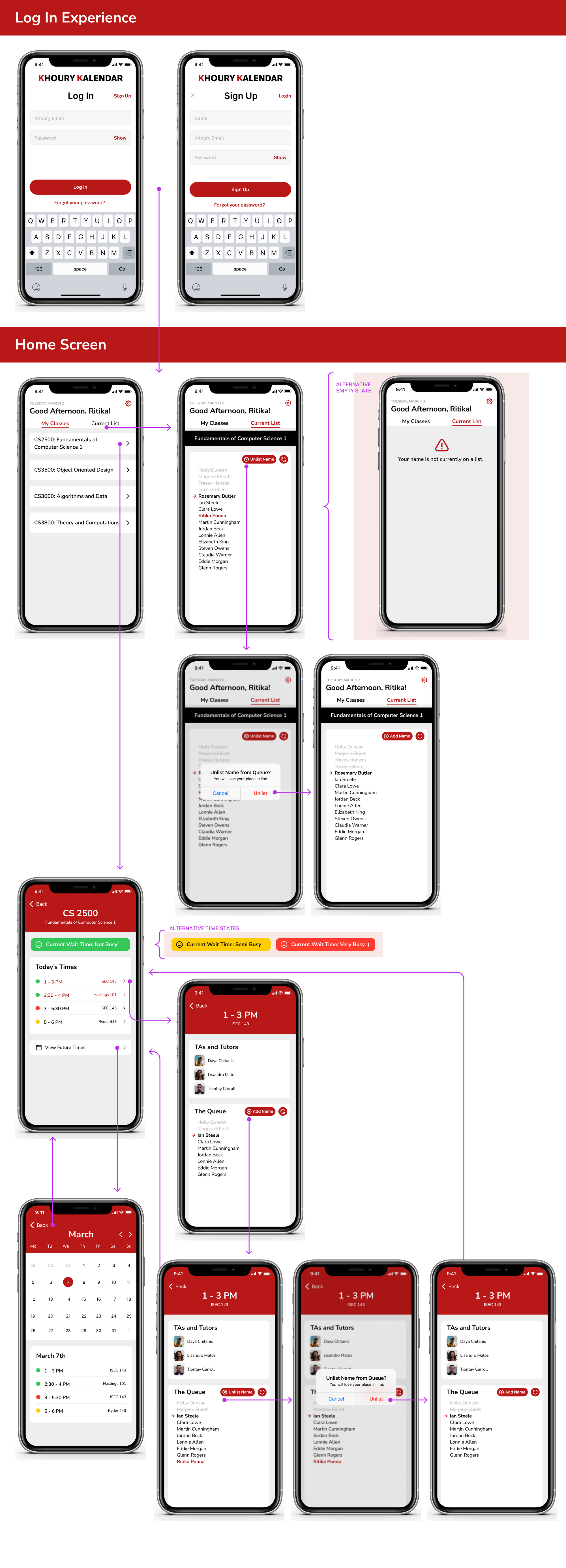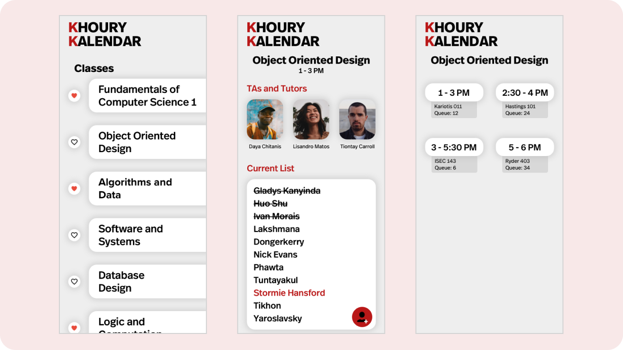 Based on this user research, we designed Khoury Kalendar to be a simple, easy-to-use app that would provide all of the relevant information in one place. We started by creating low-fidelity screens to outline the main features of the app. These included a calendar view that would show all of the available office hours, a queue feature that would allow students to add their name to the waitlist, and a notification system to alert students when it was their turn to receive help.