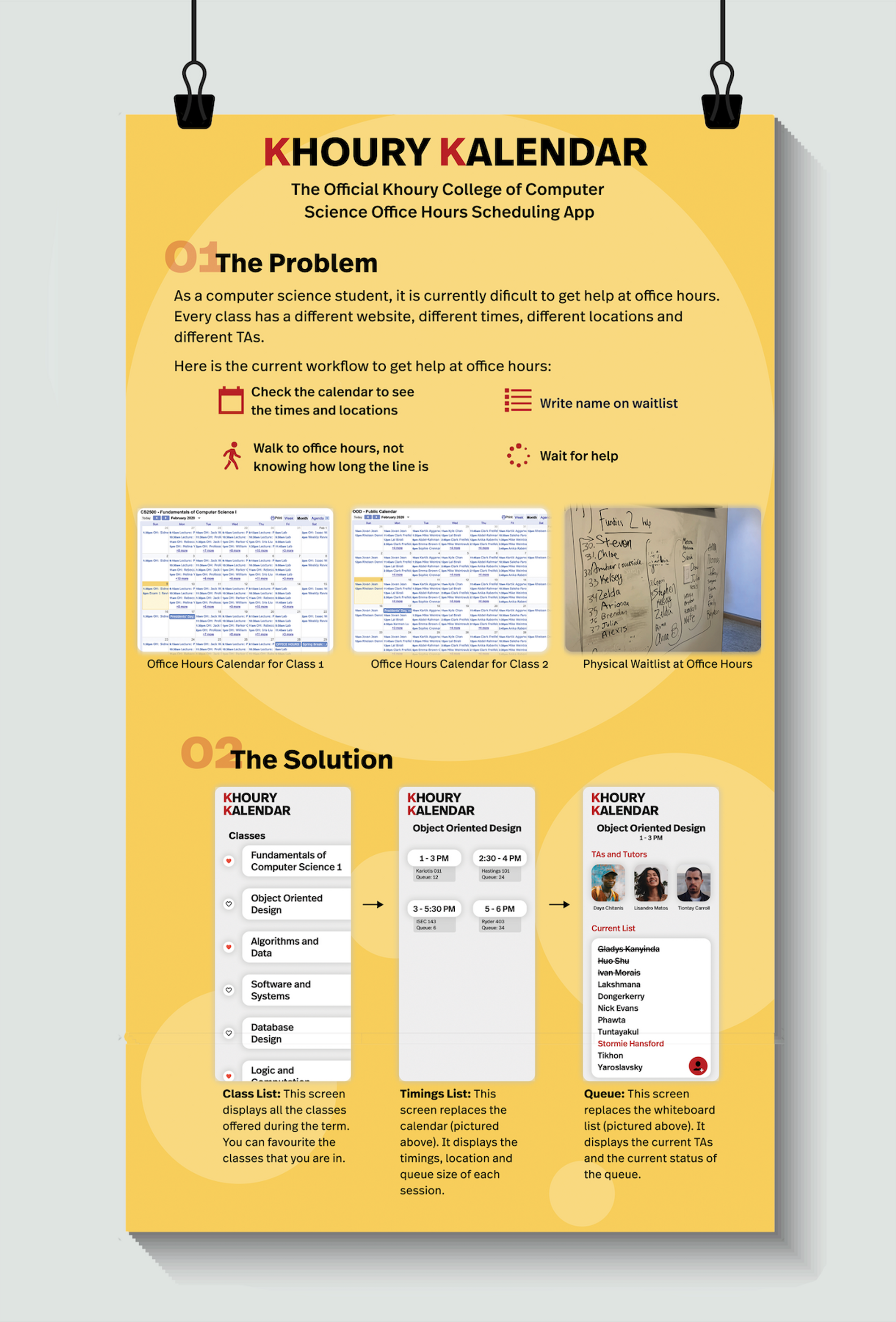 Khoury Kalendar streamlines the office hours process for computer science students, providing all relevant information in one place. User research and design ensured the app met user needs and provided an intuitive experience.